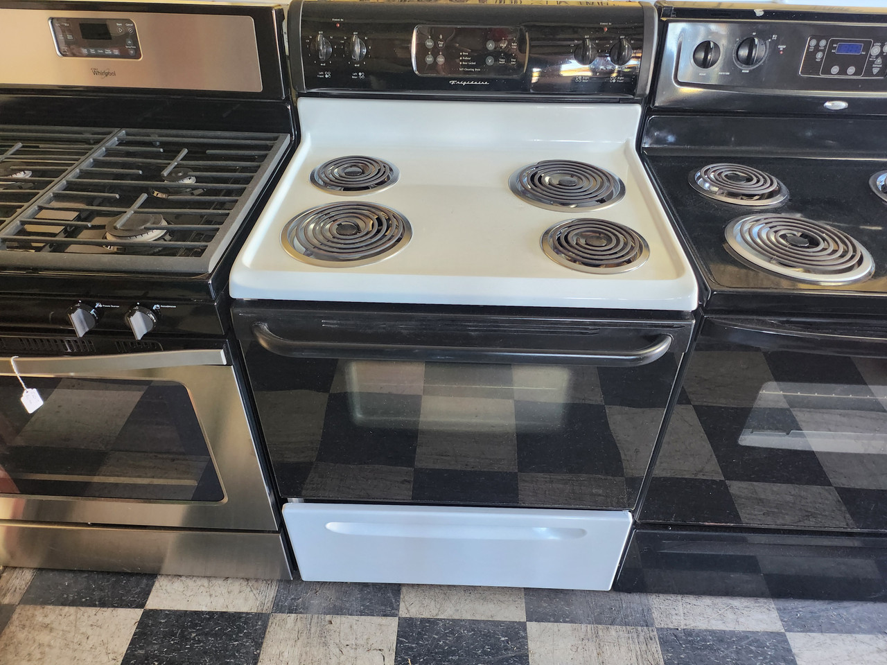 FRIGIDAIRE 30 INCH FREESTANDING ELECTRIC RANGE COIL BURNERS 2 LARGE 2 SMALL SELF CLEANING OVEN BLACK GLASS OVEN DOOR WHITE TOP AND SIDES LOCATED IN OUR PORTLAND OREGON APPLIANCE STORE SKU 19438