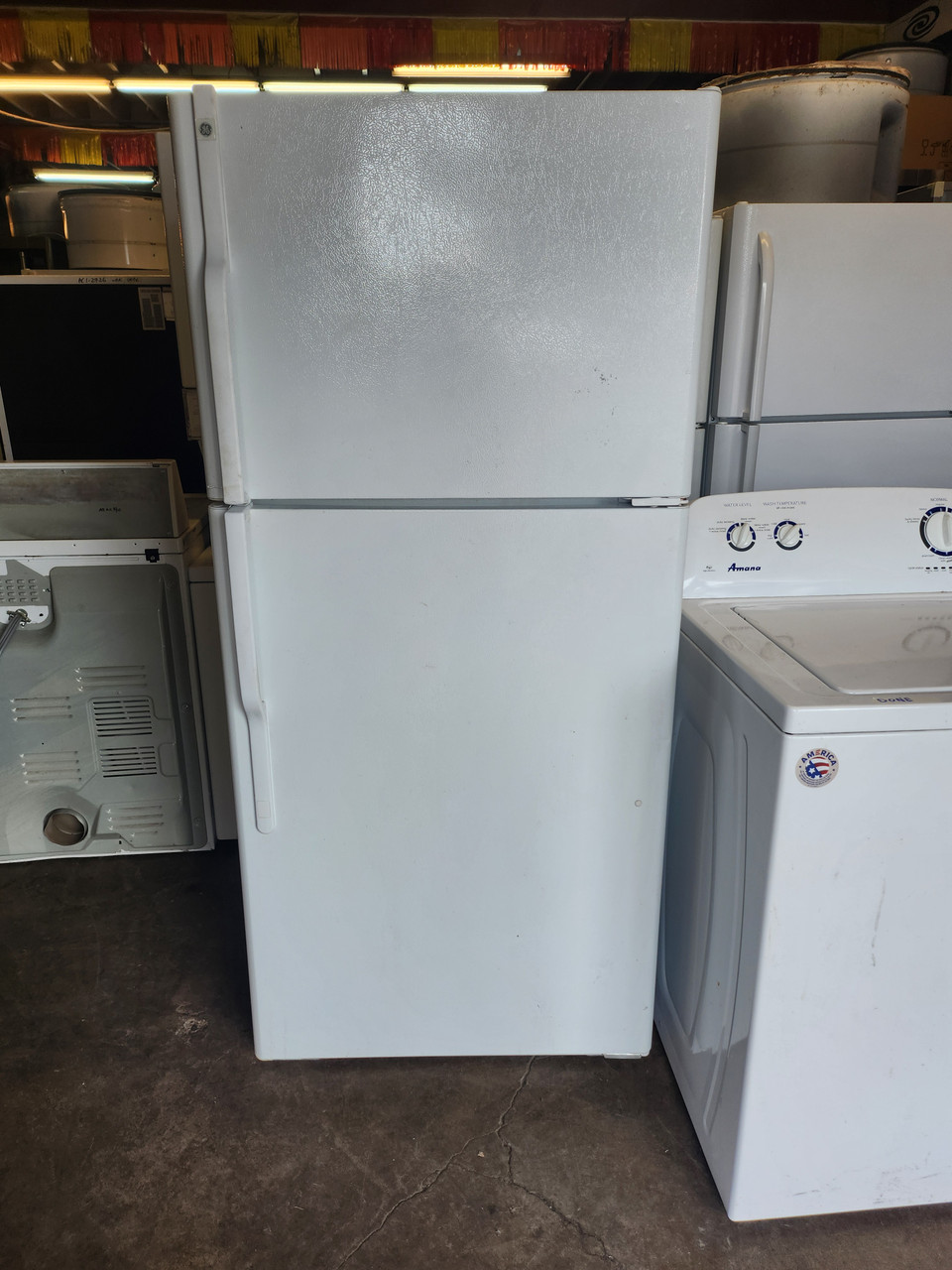 GE 18 CUBIC FOOT REFRIGERATOR WITH ICE MAKER TOP FREEZER GLASS SHELVES 2 CRISPER DRAWERS 1 DELI DRAWER WHITE LOCATED IN OUR PORTLAND OREGONAPPLIANCE STORE SKU 21020