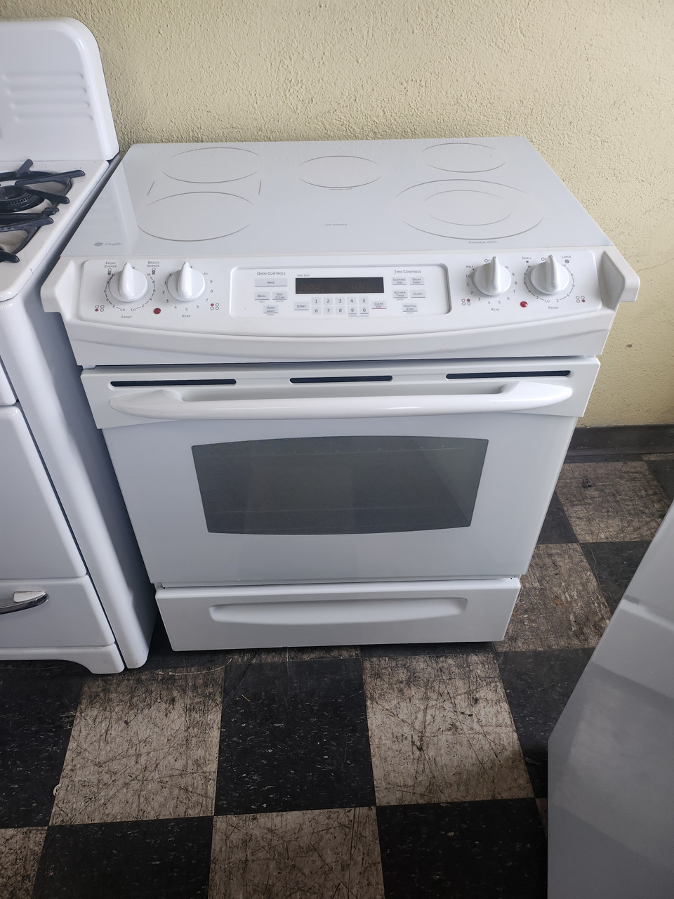 GE 30 INCH SLIDE-IN GLASS TOP ELECRTIC RANGE 5 BURNER 1 BRIDGE 1 LARGE DUAL CENTER WARMING BURNER 2 SMALL HI-LO BROIL SETTING SELF CLEANING OVEN WHITE LOCATED IN OUR PORTLAND OREGON STORE SKU 19662
