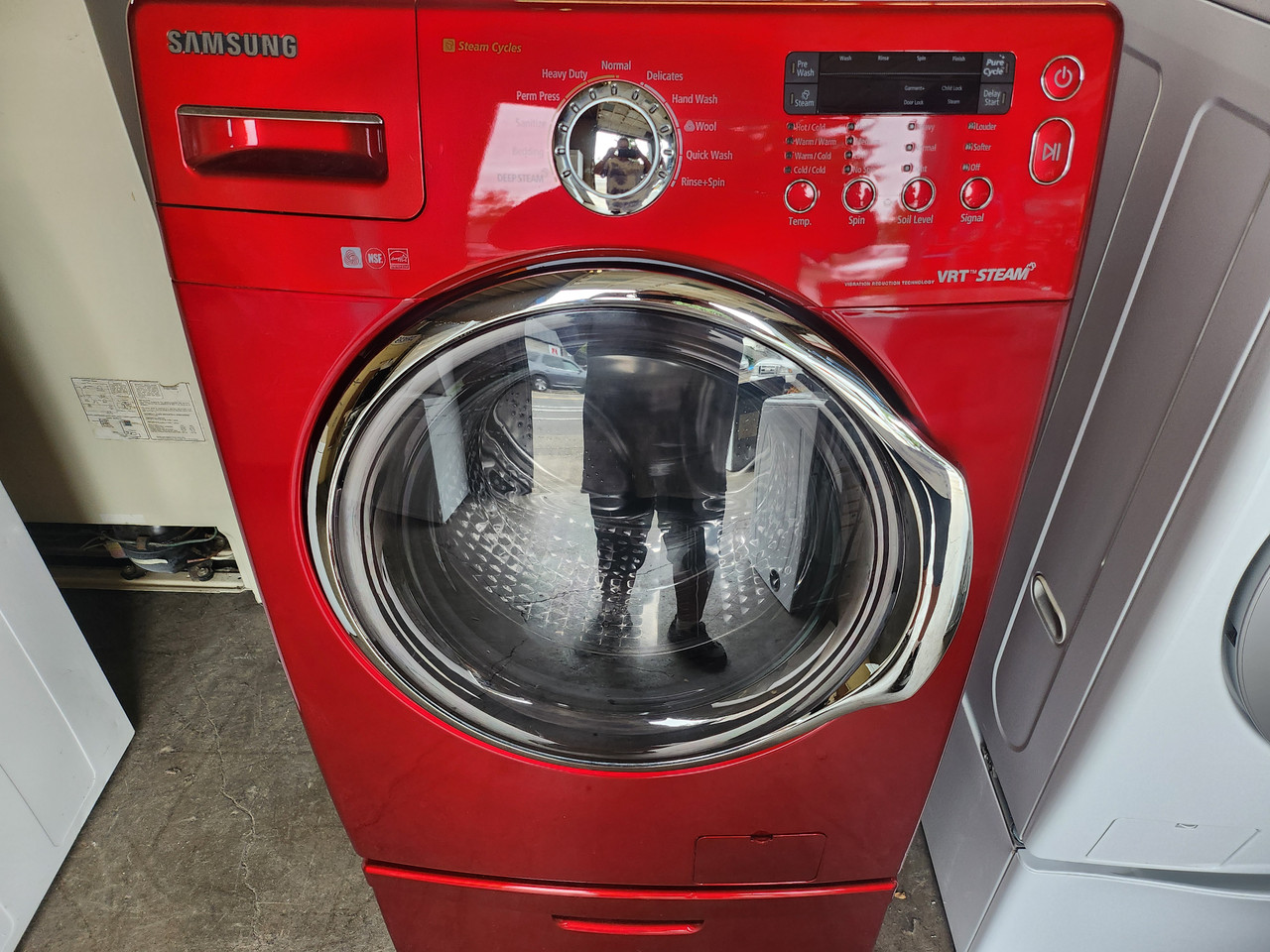SAMSUNG FRONT LOAD WASHER WITH PEDESTAL 11 CYCLE SETTINGS 4 TEMPERATURES 3 SPEED PLUS NO SPIN 3 SOIL OPTIONS RED LOCATED IN OUR POTLAND OREGON APPLIANCE STORE SKU 19524